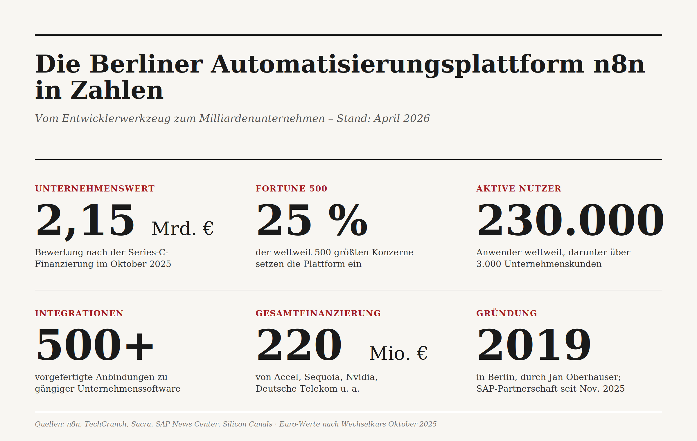 Es kommt nicht alle Tage vor, dass ein Berliner Softwareunternehmen binnen weniger Jahre eine Bewertung von 2,5 Milliarden Dollar erreicht, Nvidia und die Deutsche Telekom zu seinen Gesellschaftern zählt und ausgerechnet von SAP zum strategischen Partner erklärt wird. Genau diesen Weg hat n8n hinter sich, eine 2019 von Jan Oberhauser gegründete Plattform für Prozess- und KI-Automatisierung. Ein Viertel der Fortune-500-Unternehmen soll sie bereits einsetzen; auf der SAP-Hausmesse TechEd im vergangenen November kündigte der Walldorfer Konzern eine Integration an, die es den Agenten aus seinem Joule Studio erlauben soll, künftig mit n8n-Agenten zusammenzuarbeiten. Die Plattform ist auf dem Weg, ein Infrastrukturthema zu werden, das im deutschen Mittelstand gegenwärtig Aufmerksamkeit verdient wie kaum ein zweites.